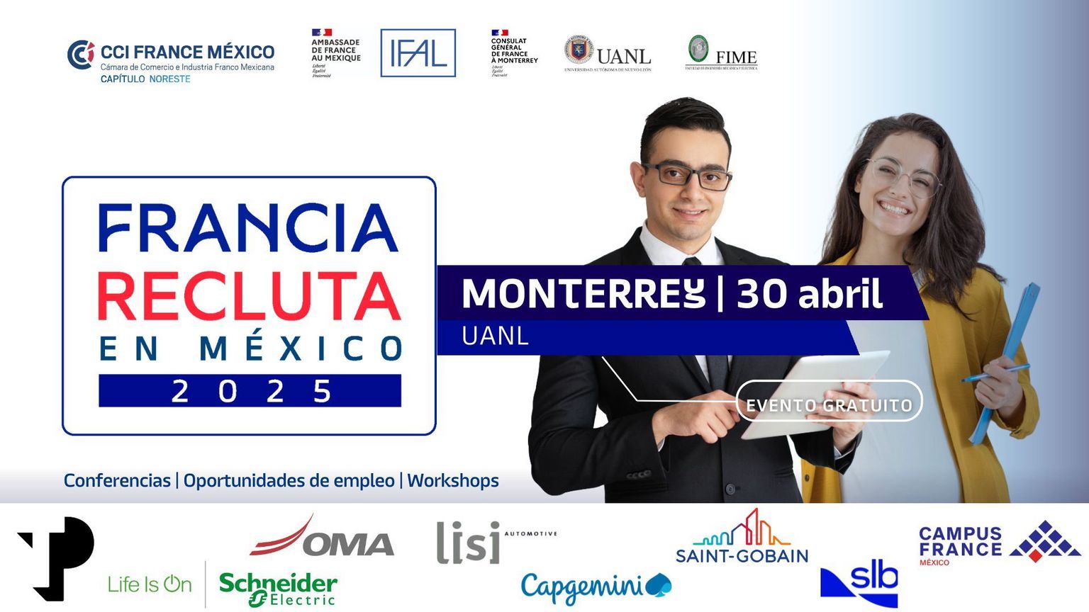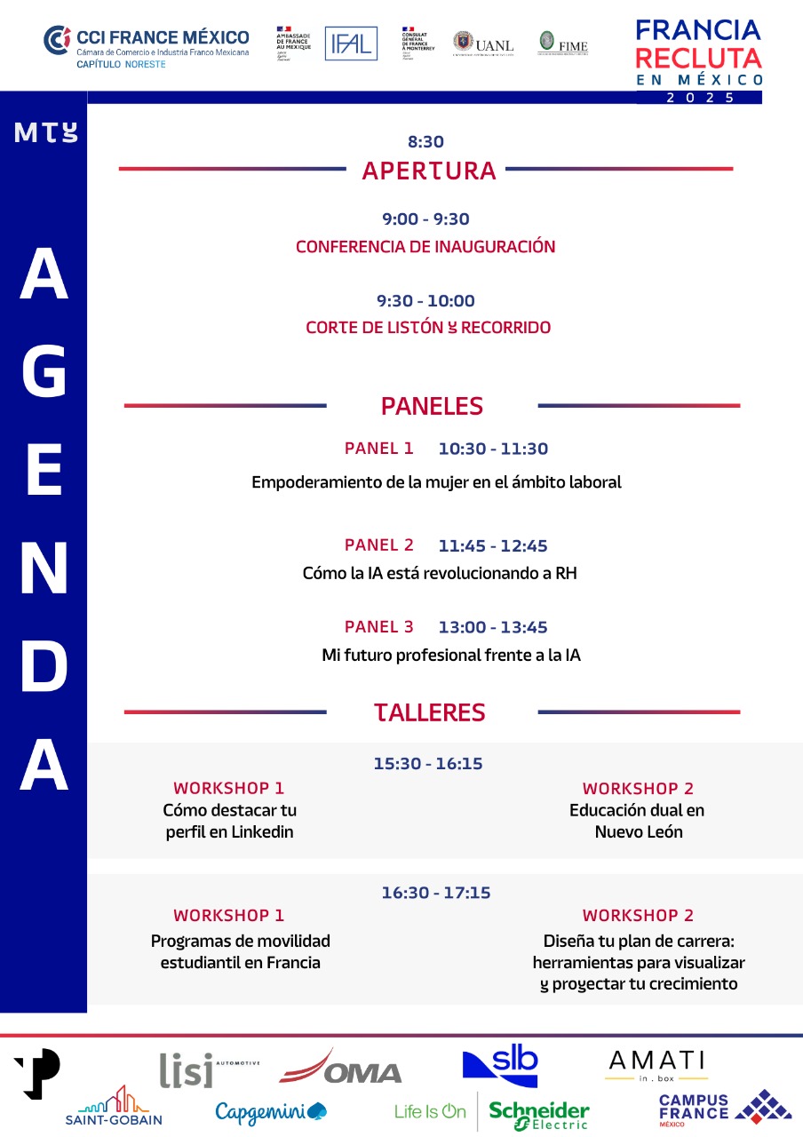 ¡Sé el primero en conocer las ofertas laborales que las empresas francesas tienen para ti en México! Asiste a la segunda edición de nuestra feria de empleo este 30 de abril, a partir de las 9:00 hrs, en la FIME UANL.