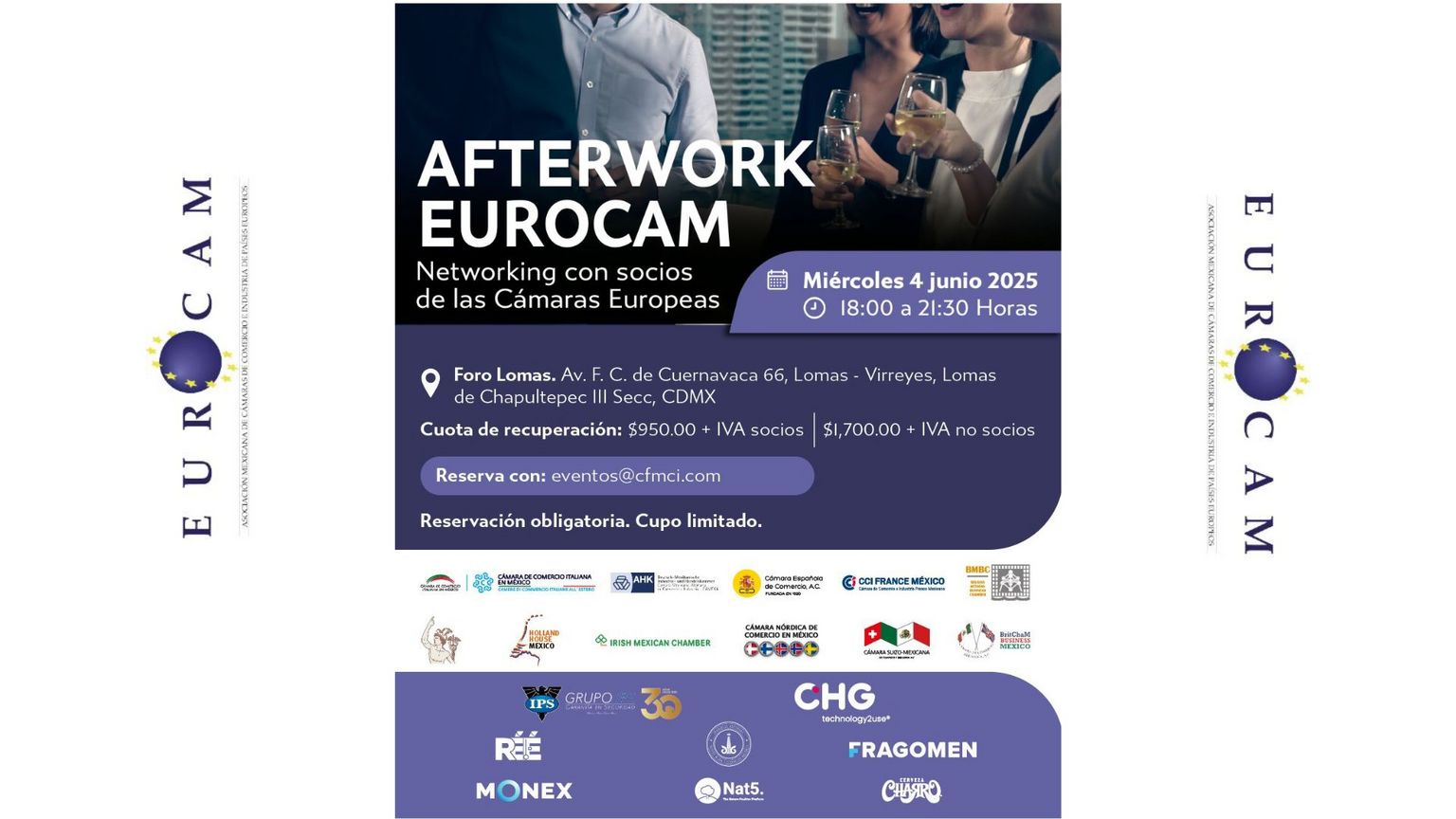 Nous vous invitons à participer à l'Afterwork Eurocam, une excellente occasion d'élargir votre réseau de contacts avec les membres des chambres de commerce européennes au Mexique.