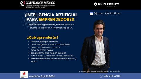 La CCI France México invite les entrepreneurs à participer à cet atelier exclusif sur l'Intelligence Artificielle, donné par Alex Castañeda, un expert en optimisation des affaires avec l'IA. Fort de son expérience au sein de PME, de startups et de multinationales telles que PepsiCo, Rappi et Mi Compa, il partagera des outils clés pour tirer parti de l'IA dans le développement des entreprises.