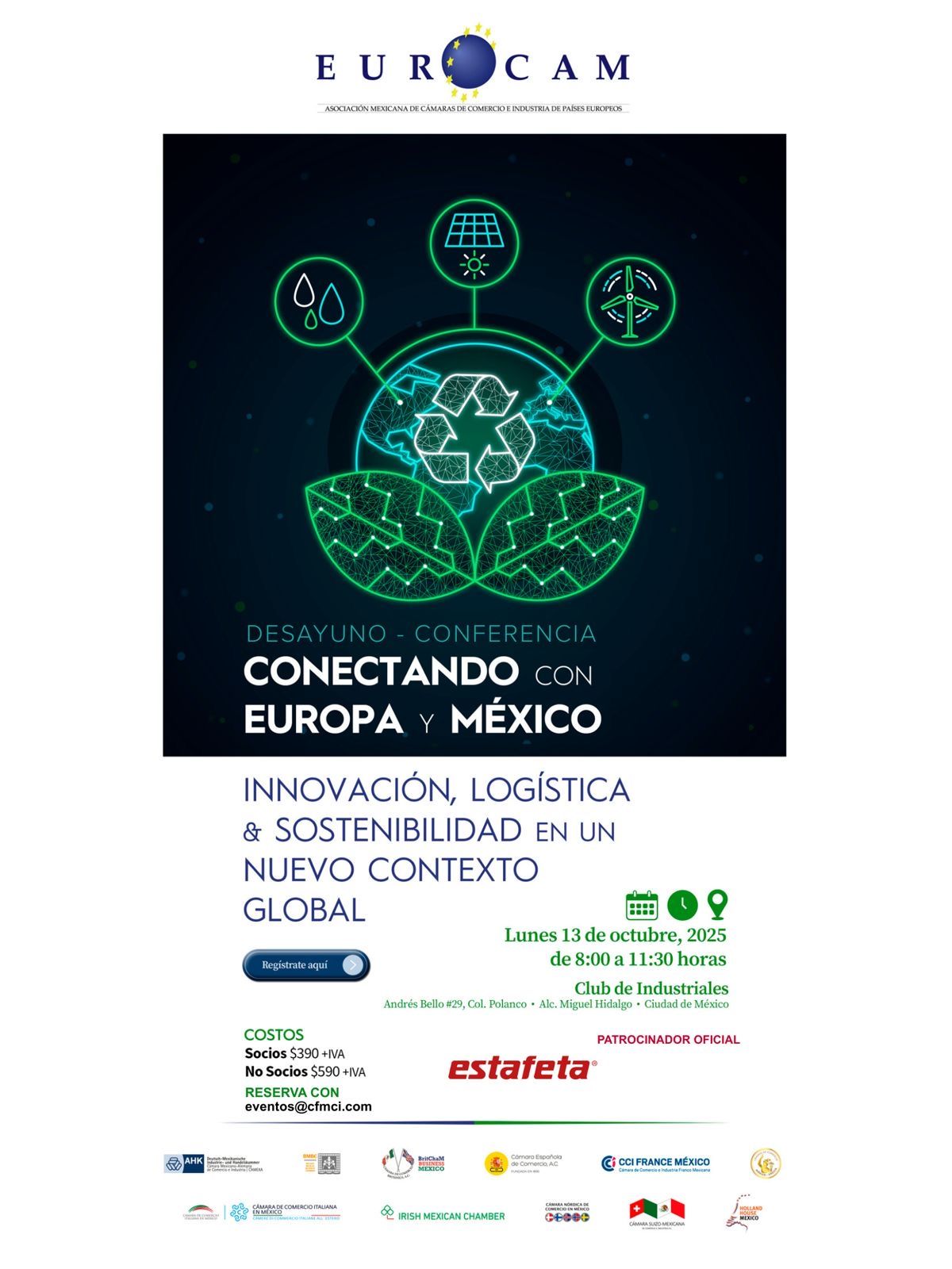 EUROCAM Mexique, avec le parrainage d’Estafeta Mexicana, invite les dirigeants d’entreprises, représentants diplomatiques et décideurs à participer à cet événement de haut niveau, qui se tiendra le 13 octobre 2025 au Club de Industriales, Polanco, Mexico.